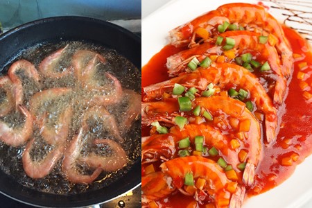 首先把买回来的虾洗干净,然后剪去虾须,去除虾背上的虾线。锅中放适量的油,油热后把大虾放过去炸,炸到虾变红捞出。用另外一个锅,锅内放入少量的油,把姜、蒜、葱末爆香后,放入适量的番茄汁炒一分钟。再把炸好的大虾放进去翻炒,加入适量的盐、料酒、酱油焖五分钟。出锅前倒入适量的生粉水,收汁勾芡即可。摆好盘后撒点葱花,简直就是完美。