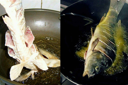 7、将适当量的植物油倒入炒锅之中,油温烧热开始出现密集的气泡时。手拿着鲤鱼的尾巴,先把鱼头浸在油锅之中,再用小勺轻轻地舀在鱼身上,这样可以使鲤鱼的造型基本定型好。鲤鱼定型好后,把鲤鱼顺着锅边下入其中。一边中火慢炸鲤鱼,一边用勺子往鱼身上浇油。