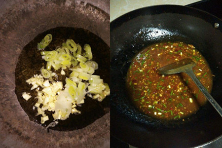 9、利用炒锅之中剩下的植物油,油温烧热一会儿后,把葱姜蒜末下入其中。小火翻炒香味慢慢挥发出来后,往锅中加入适当量的番茄酱。这时候再倒入些许的清水,撒上些食盐、胡椒粉、白糖、味精,淋些香醋进行调味。炒锅中的汤汁大火滚开后,淋入些水淀粉勾芡。