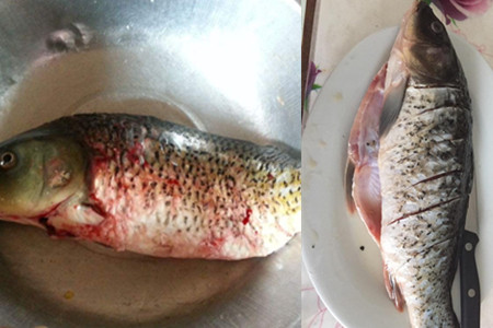 2、先将从早市买回家的新鲜的鲤鱼宰杀,用刀刮掉上面的鳞片,去掉内脏等不能食用的部分。放在水龙头的流水下,冲洗干净内外的杂质和污血。把处理干净的鲤鱼摆在菜板之上,用刀在鱼身上划上几刀。要注意刀口的距离,尽量每隔两厘米左右便划一刀。