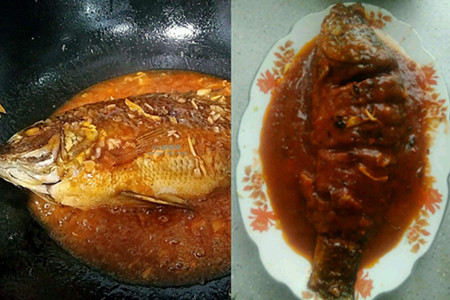 10、紧接着把之前已经炸好的鲤鱼放入炒锅中,把芡汁不断地浇在鱼身上。出锅盛盘前,撒上些香菜叶或者葱花便可食用了。
