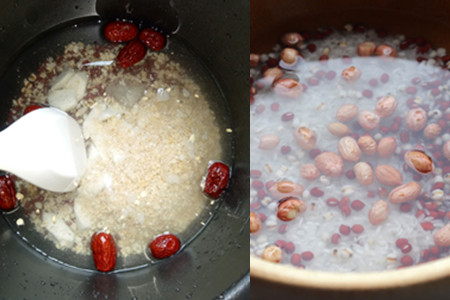 step6、待锅内的粥变得粘稠后,再加入倒红枣和桂圆肉。