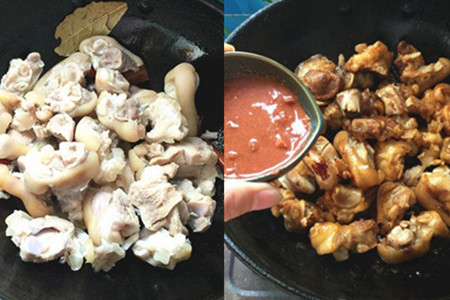 炒锅洗净上灶,倒入适量油,油烧热之后,将干辣椒、八角、桂皮、香叶和姜片下锅,小火煸炒。锅中的香料炒出香味之后,将滤干水分的猪蹄下锅翻炒。猪蹄表皮炒至微微焦黄后,取10毫升料酒沿着锅边淋入,翻炒几下,再烹入10毫升生抽,炒匀。猪蹄翻炒上色后,取适量豆腐乳块碾碎倒入锅中,再淋入适量腐乳汁,翻炒至猪蹄入味。