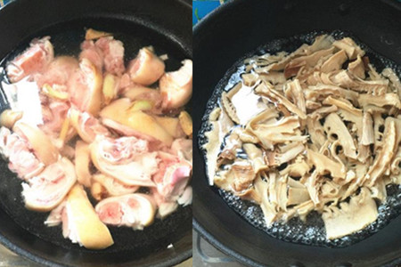 煮锅洗净上灶,兑入适量冷水,捞出猪蹄转入锅中,加入几片姜片,再烹入10毫升料酒,大火煮沸,焯出血沫后,捞出锅倒入菜篮中,开水龙头的清水将猪蹄冲洗干净,滤干水分待用。另取一个锅置于灶上,兑入半锅清水,大火煮开,将泡好洗净的笋干下沸水中焯一下,捞出滤干水分。