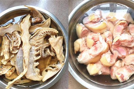 笋干提前用温水泡发。猪蹄刮掉表面上的杂毛和污垢,清洗干净,斩成块状,放入清水中泡2个小时,期间换3次水,将猪蹄的血水泡出来。