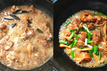 猪蹄炒至入味后,往锅中兑入开水没过猪蹄,转为大火煮沸。煮沸之后,将滤干水分的笋干下锅,调入适量食盐,炒匀。电炖锅洗净擦干,将炒锅中的食材和汤汁转入电炖锅,通电小火炖煮2个小时。两个小时后,将电炖锅中的猪蹄和汤汁再次转入炒锅,加入葱段,开大火把汤汁煮干即刻起锅。