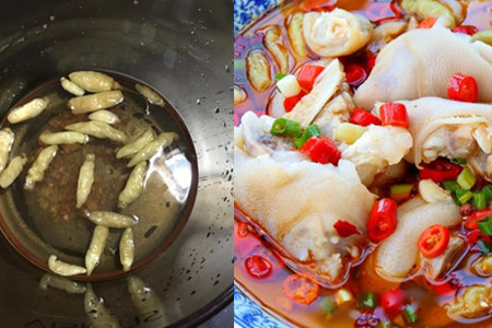 准备一个大盆,加入适量米醋、食盐和冰糖,搅匀,再放入适量野山椒,兑入适量凉白开,接着将泡凉的猪蹄放入,拌匀,加盖放入冰箱冷藏两天。吃的时候,舀出猪蹄块和汤汁,撒上红尖椒段和葱花,淋上辣椒油,拌匀即可享用。