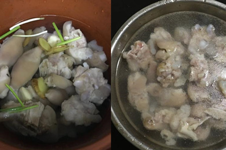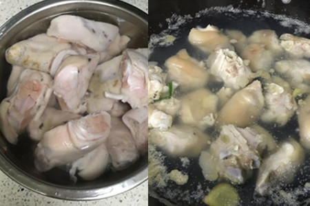 猪蹄刮掉表面的杂毛和污垢,斩成大块,开水龙头的清水反复冲洗30分钟,去掉多余的油脂。煮锅洗净上灶,加入大半锅清水,加入少许葱姜,开大火煮沸后再煮片刻,将冲洗干净的猪蹄块下沸水中焯一下,捞出,冲洗掉表面的浮沫。