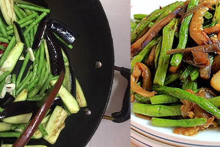 大约翻炒3分钟左右,就把之前炸好的茄子和豇豆倒入进去一起翻炒,再放一些酱油、盐、蚝油,翻炒均匀就可以将它装盘子吃了。