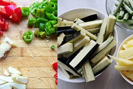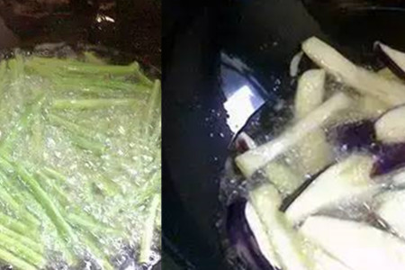 茄子和豇豆同样是需要将它切好的。在锅里面倒入比较多的食用油,等到油温变热的时候,将豆角和豇豆分开倒入油锅里面炸软,两者的外皮变软了之后就可以捞出来,将上面多余的油沥干净。