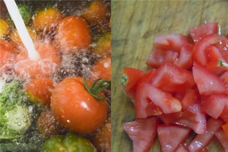 把番茄用清水清洗干净,然后放在菜板上面切,先把它竖着切成一片的,再把它切成一条一条的,之后再根据你自己的喜好把它切成大小不一的丁状,我们把切好的番茄装进一个碗里,这样食材就准备齐全了。不喜欢吃皮的朋友可以先烧一点开水,然后把番茄放进去烫一下再拿出来就可以直接撕皮了。下面我们就开始来炒鸡蛋,先把锅放在灶上面烧热。