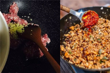 我们可以在切好的肉沫里面放一点料酒去腥,之后再把家里面的姜蒜拿出来,清理干净切成沫,现在材料准备齐全了,我们就开始炒肉末酱。首先,在烧热的锅里倒少许的油,等油烧好之后再把肉沫倒进去开始翻炒,在肉炒了30秒左右的时候倒入准备好的葱姜沫,把它们炒均匀之后就可以在里面加入一点豆瓣酱和在外面超市买的甜面酱。
