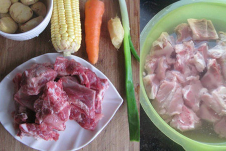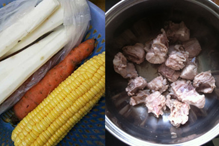 首先,准备好熬煮玉米排骨汤所需要的各种食材,包括新鲜玉米、新鲜排骨、新鲜胡萝卜以及葱、姜、蒜等辅料。