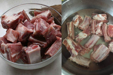 2、先将从早市买回家的新鲜的排骨浸泡在装有清水的小盆里,以析出其中的污血。排骨上的污血一定要清洗干净,不然会影响吃起来的口感。把浸泡完的排骨捞出,放在流水下冲洗几遍。再摆在菜板之上,用刀斩成小段状。