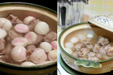 6、将适当量的冷水倒入炖锅里,放入几片生姜。中火煮开后,把排骨和萝卜全部下入其中,炖煮至萝卜熟透后。往炖锅里撒上些胡椒粉和食盐进行调味,便可盛在碗里食用了。