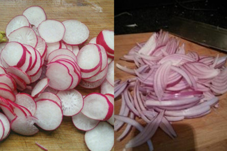 1、准备的食材有樱桃萝卜、羊肉、洋葱、青辣椒。