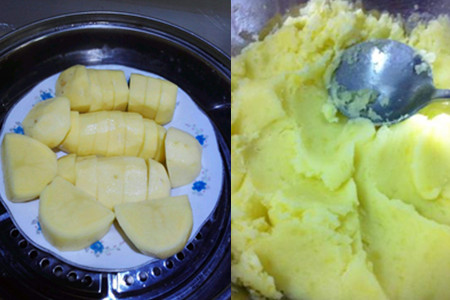 3、把蒸熟的土豆片从蒸锅里取出,装在一个小碗之中,用勺子把土豆压成泥状。