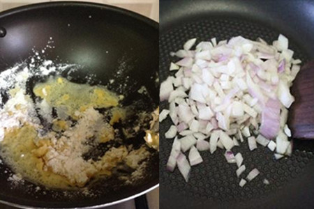 5、另外拿一个炒锅,油温烧热出现些气泡后。把黄油下入热油锅里,待黄油受热融化后。这时候把洋葱丁倒入锅中,中火进行翻炒爆香。炒至洋葱丁呈现半透明色泽后,把面粉黄油汤倒入锅中一起熬煮。