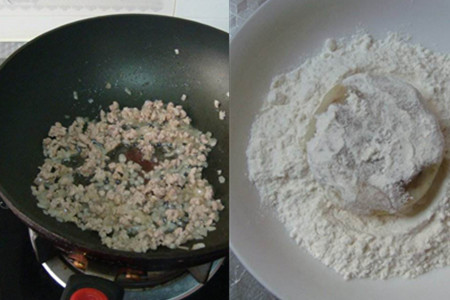 7、把炒好的洋葱肉馅倒入土豆泥中,用勺子进行均匀地搅拌。这时候再用手把馅料揉搓小球,再轻轻地压成饼。再饼上均匀地裹上一层面粉,紧接着放入蛋液之中,再取出在装有面包糠的小蝶中滚上一圈。
