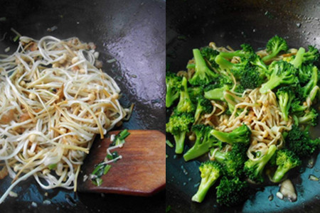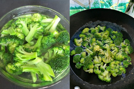 8、这时候再淋入之前调制好的酱汁,汤汁大火滚开后。把之前焯过水的西兰花倒入炒锅里,翻炒均匀片刻便可出锅食用了。