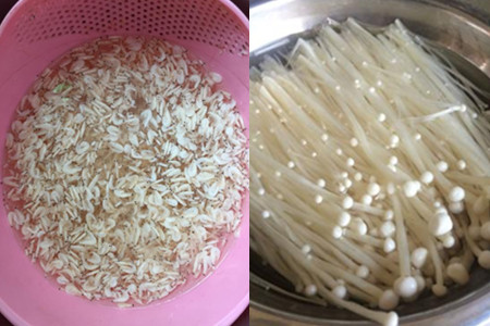 5、金针菇用刀切掉根部,再用手把金针菇撕开成丝。把金针菇泡在撒有食盐的水里,以消除里面的细菌和异味。浸泡好后再捞出,放在流水下冲洗一遍备用。
