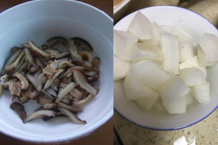 5、香菇浸泡在撒上些许食盐的清水里,浸泡一会儿。再捞出冲洗一下,用刀切成细丝状。