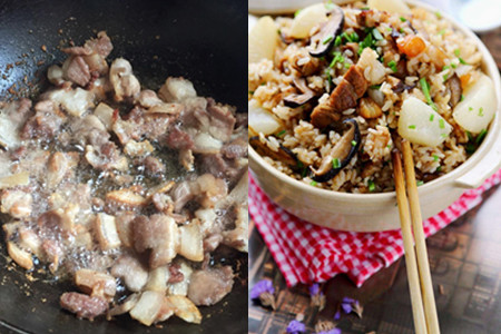 9、把米饭放入高压锅,在上面摆放上白萝卜块和之前炒制好的食材,就可以开始煮饭了。