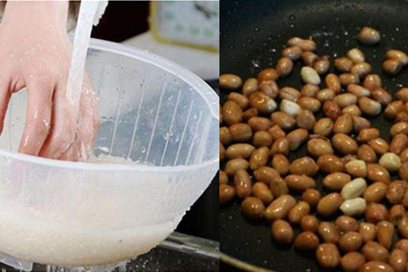 4、将适当量的植物油倒入炒锅之中,把准备好的花生仁下入油锅里。小火炸至花生仁金黄,便可用漏勺把它全部捞出备用。
