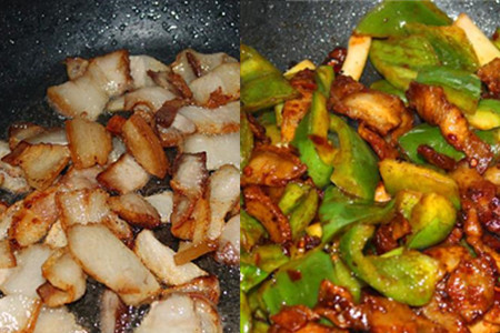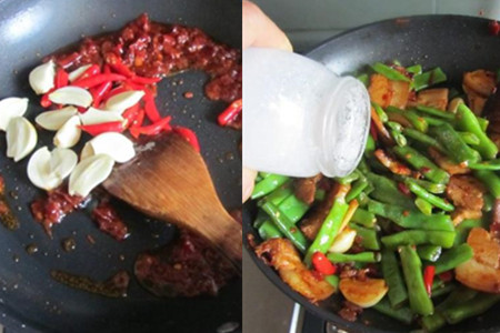 五花肉漂洗干净,下沸水焯煮至八成熟,水中加入适量花椒、姜片和料酒可以去除腥味。水中加少许食盐和油能够使得豆子颜色不变,豆子要煮久一点,吃了没有全熟的是会中毒的。炒菜时先煸炒豆瓣酱,煸出红油后加入辣椒和蒜瓣一起煸炒。锅中的调料都炒出香味后,再放入五花肉片一起炒,炒至表面微微焦黄菜加入四季豆。