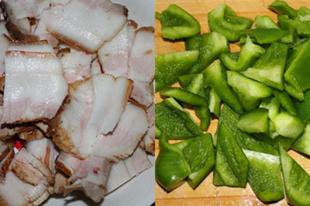煮锅洗净上灶,加入适量冷水,将五花肉洗净下锅,加入葱段、花椒、姜片和黄酒,大火煮沸。煮沸之后,撇去水面上的浮沫,煮10分钟,捞出放凉。将晾凉的五花肉切成薄片待用。青椒洗净切成小块,葱拍一下再切成小段待用。