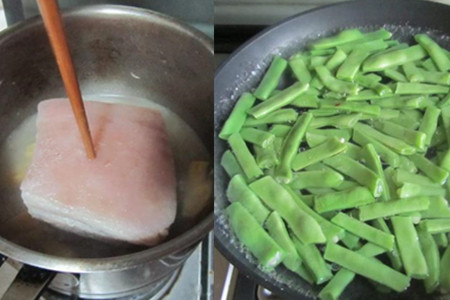 煮锅洗净上灶,加入适量凉水,放入几片姜片、花椒粒和料酒,大火煮沸。煮沸之后,将五花肉漂洗干净下沸水,煮10分钟,捞出晾凉。五花肉晾凉后,切成小片待用。烧一锅开水,加少许食盐和食用油,将四季豆下锅,煮至8成熟,捞出滤干水分待用。