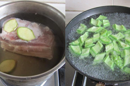 煮锅洗净上灶,放入冷水,加入少许料酒和姜片,把洗净的五花肉放入冷水中,克调大火煮开。煮开之后,将水面上的浮沫捞出,转为小火,继续煮至筷子很容易插进肉块,捞出来晾凉。苦瓜洗净切成菱形块,煮锅上灶加水烧开,加入少许油和盐,再放入苦瓜块,煮至8成熟时捞出,放入冷水中泡凉后控干水分。