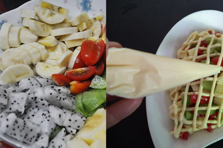 接下来为大家介绍第一种做法,是一种超级简单的做法,在水果店或是超市挑选自己喜欢的新鲜水果或是适合自己体制的新鲜水果,带回家中清洗干净后,切成自己喜欢的样子,然后加上沙拉酱便可以了,非常适合平时生活中食用,简单快捷,居家必备。