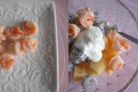 其实水果沙拉中也不一定要全部都是水果,在水果中放入鲜虾便是一个不错的选择,首先将虾煮熟去壳,然后将水果清洗干净后,切块与虾一起放入碗中,再然后淋上沙拉酱,美味而且健康的食物便做好了。