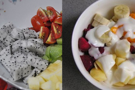 常吃水果不仅能够促进身体健康,也是减肥必备佳品,所需材料有:火龙果50克、橙子50克、苹果50克、其他喜欢苹果若干。总量不宜超过300克,水果太多便起不到减肥的效果了,因为水果中的果糖含量是我们所不能忽视的。所需配料为酸奶60毫升,将水果摆在盘中,从中间向外均匀浇上酸奶即可。