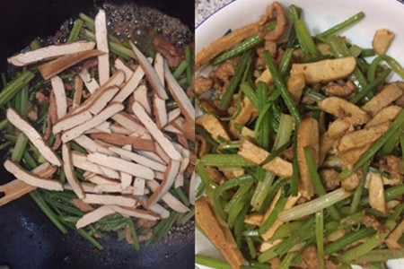 处理好芹菜后,香干也腌制好了,那么就把香干取出来,用刀切成细细的长条,然后就烧开锅,放下油,放入生姜花椒辣椒这些炒一下,然后捞出来,剩下油在锅里面,这个时候再放进香干翻炒,再加入芹菜翻炒,翻炒到几分钟之后就加入一点盐,然后就可以取出装盘了,吃的时候淋上香油会更加的香。