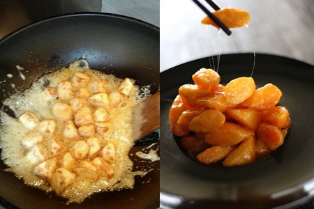那第二种美食是以山药、白砂糖为原料的甜品小吃----拔丝山药,它以软糯的口感征服了不少的吃货,而且重要的一点便是吃多少都不会胖。所以拔丝山药受到了减肥朋友们的热捧,因为再也不用担心吃甜品会胖。做法也十分的简单,自己在家也可以尝试制作。