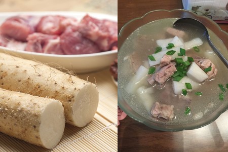 山药一般的做法都是煲汤喝,那小编今天推荐的第一种山药美食----山药排骨汤,其味道清甜,口感十分的软糯香甜。而且做法也十分简单。先把排骨剁成段,然后在沸水中煮五分钟即可。姜洗干净剁碎备用,山药削皮洗干净,切成适量的块状。排骨、姜放进锅中,加适量的水大火煮开,煮开后加入山药块小火慢炖一小半时即可。喝之前放入适量的盐调味。
