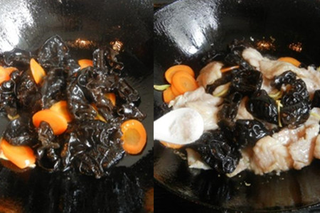 黑木耳事先泡发,漂洗干净。胡萝卜洗净切成小片。煮锅洗净上灶,放入适量凉水,大火煮开,将黑木耳和胡萝卜片下沸水烫5分钟,捞出滤干待用。
