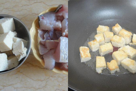 青鱼清洗干净斩成小块,冻豆腐切成小块。大蒜和生姜去皮切成片,青蒜去根洗净,将梗部和叶子分别切小段。炒锅洗净擦干,置于灶上,锅内倒入油,油温热之后,将冻豆腐块下锅煎制。冻豆腐煎至双面微焦,盛出锅待用。