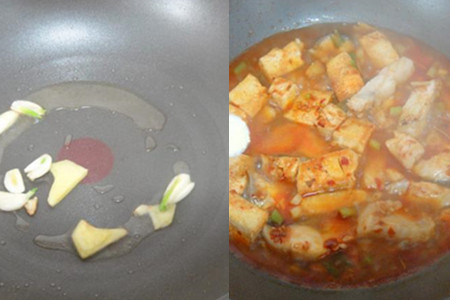 用炒锅中剩下的热油把蒜片和姜片爆香。姜蒜片爆出香味之后,舀适量豆瓣酱下锅煸炒。炒出香味之后,往锅中兑入适量开水,再放入青鱼块和青蒜梗,烹入适量料酒,大火煮沸。煮沸之后,将冻豆腐块倒入,加盖,煮开后转为中火,将鱼块和豆腐块煮入味。打开锅盖,调入适量白糖提鲜,撒入青蒜叶即可上桌。