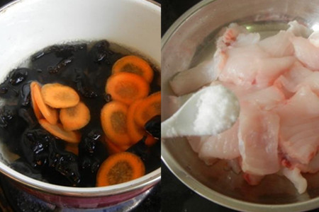 食材:青鱼中段450克、黑木耳10朵、胡萝卜50克、鸡蛋1个、胡椒粉、生抽、葱姜、白糖、芝麻油、盐、油。
