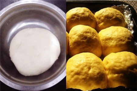 第二步:重新找出一个容器,在里面放入剩下的面粉和少量的酵母粉,还需要在里面放一些食用盐这样做出来的面包才有味;把之前发好酵的面团也放进来,之后我们就可以开始搅拌了,按拌完成后我们就继续下一步,把和好的面团分离成一小部分一小部分的,把搓揉的小面团放在锡箔纸上面,几个小时后,面团会发酵变得越来越大。