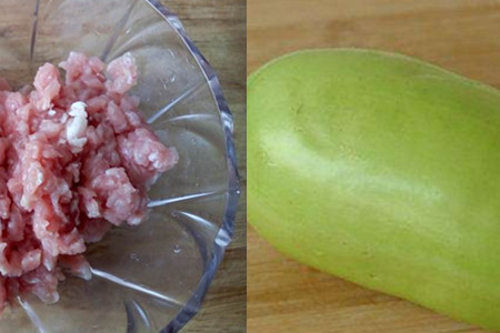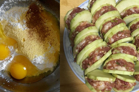 选一些个头大的茄子,然后切掉尾部,剩下的部分切成厚片,切的时候注意不要一刀切开,两片茄子底部要连接着。茄子容易氧化变黑,切完之后我们放在盐水里泡一下就好了。取出两个茄子片,把肉馅装进去,不要装太多,否则就会合不上了。装好之后放在干净的地方,按照这个方法把其他茄子都做好。