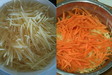土豆非常容易氧化,所以我们去除外皮之后可以放在清水里好好清洗一下,这样可以既可以去除表面的泥土,还可以洗掉淀粉,防止表面变黑。然后准备一些香葱、胡萝卜丝和香菜,土豆洗干净之后,我们用菜刀切成细丝,如果担心自己切不好,可以用专门工具做土豆丝。然后把土豆丝放进清水里,再次清洗掉多余的淀粉,然后捞出来沥干水分。