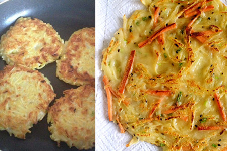 基本的面糊准备好之后,我们就可以开始烙饼了,取出平底锅,倒入适量的食用油,加热至五层左右,我们就可以用勺子取出适量的面糊倒进锅里,然后用铲子摊成圆形。注意火候不要太大,慢慢煎,等到煎成焦黄色,我们就可以拿出来吃了。