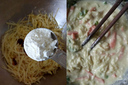 土豆丝放进小盆里,然后加入香葱、萝卜丝以及其他配菜,打两个鸡蛋进去,味道会更加香。土豆本身没有什么味道,所以我们需要加一些调味品,加一些精盐、胡椒粉、蚝油以及适量的香油,然后搅拌均匀,还有我们要加一些面粉,这样土豆丝才会黏在一起。