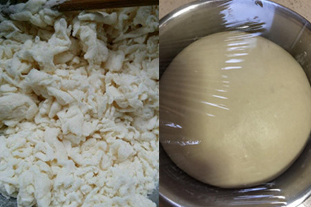 3、盆中的粉类混合完成后,用手先搅成棉絮状。紧接着再揉成团状,揉面团不需要揉太久,但是一定要揉至没有颗粒状为止。在揉好的面团上盖上一层湿纱布,置在一边醒发一会儿。