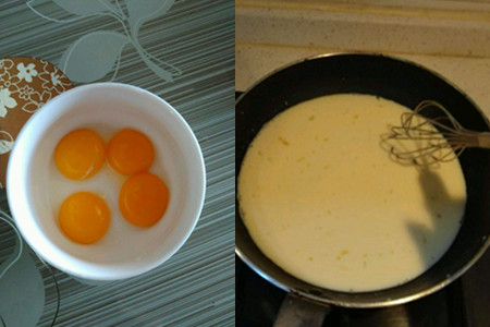 3、将适量的牛奶倒入煮锅里,往里加入些许的白糖和蛋黄液,用勺子进行充分地搅拌直至白糖融化。小火加热煮至呈现糊状,煮的过程中要不间断地用勺子进行搅匀,不然蛋奶糊容易粘锅。