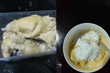 4、把从超市买回家的新鲜的榴莲,用刀剥开外层的刺壳。取出里面的果肉,再去掉果核。把榴莲肉装入一个容器之中,用勺子捣烂成泥。这时候再把些许的糯米粉和白糖放入榴莲泥之中,用勺子进行均匀地搅拌。但是糯米粉的量不宜过多,不然会影响吃起来的感觉。